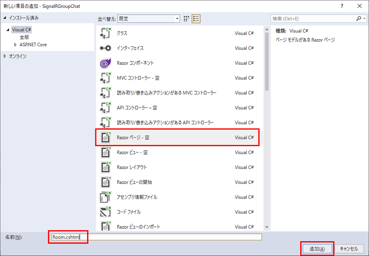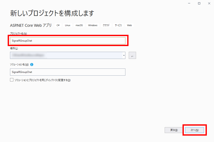 - プロジェクト名は「SignalRGroupChat」とした