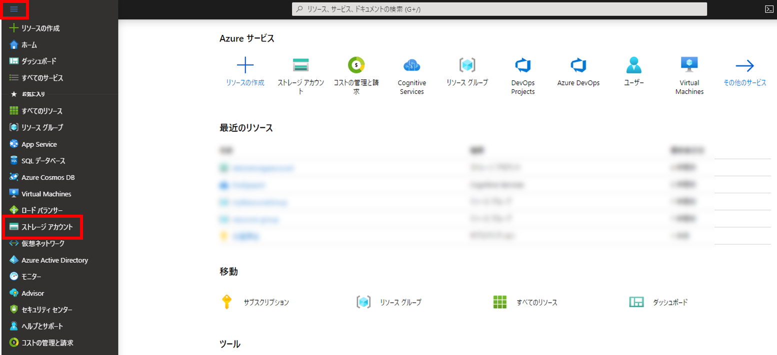 まずはストレージアカウントというコンテナ―の上位概念を作成。作成ページへの行き方はいろいろあると思うけど、ポータルのホーム画面から左上の三本線アイコンから「ストレージアカウント」をクリックするのが簡単。