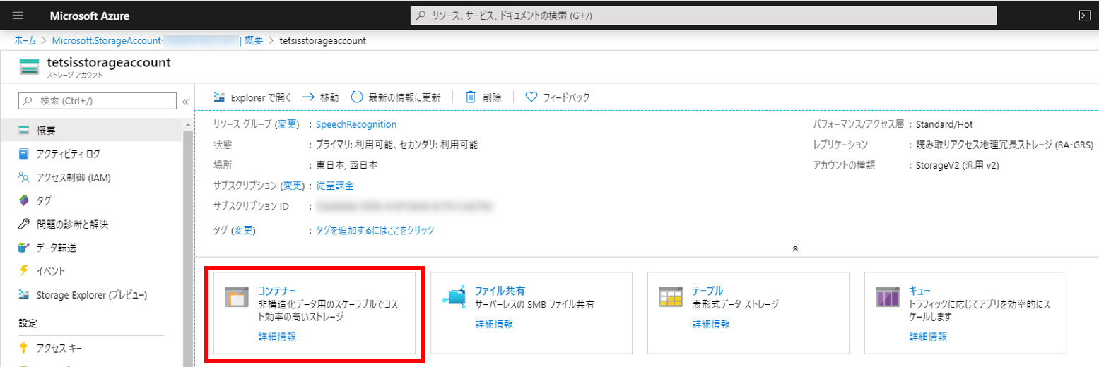 ストレージアカウント名はAzure内でユニークでなければならない。今回は「tetsisstorageaccount」にしてみた。リソースグループは事前に作っておいた「SpeechRecognition」、場所は「東日本」にした。その他はデフォルト。