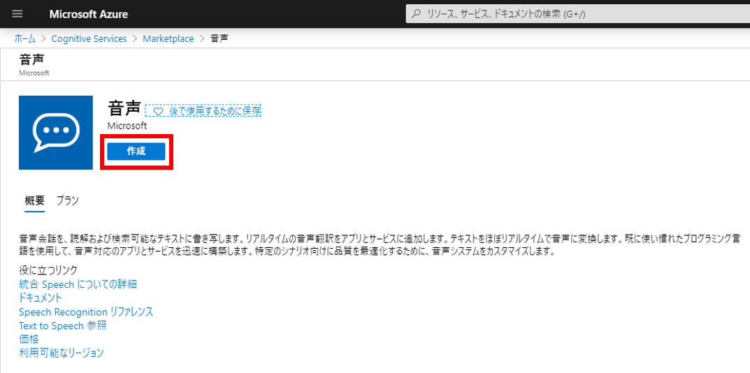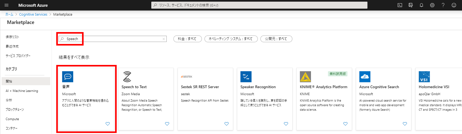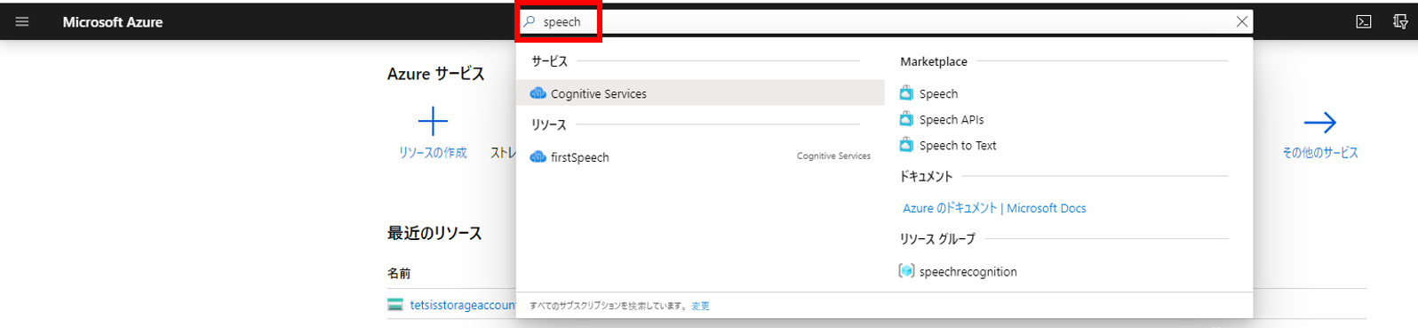 音声認識サービスのリソースを作成する。作成ページに行くにはポータル画面の検索欄で「speech」と入力して表示される「Cognitive Services」をクリックするのが簡単。Cognitive ServicesはSpeech Servicesの上位概念。