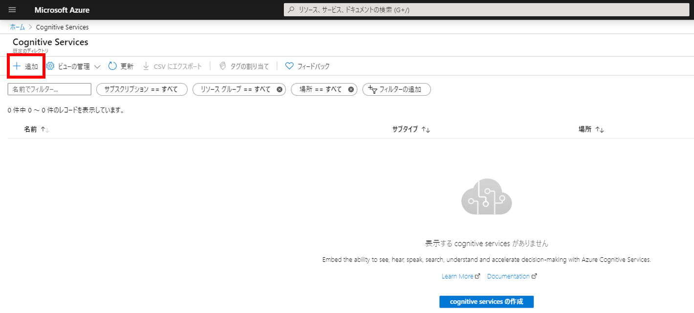 Azureポータル画面でリソースの作成と認証情報の取得を行う。