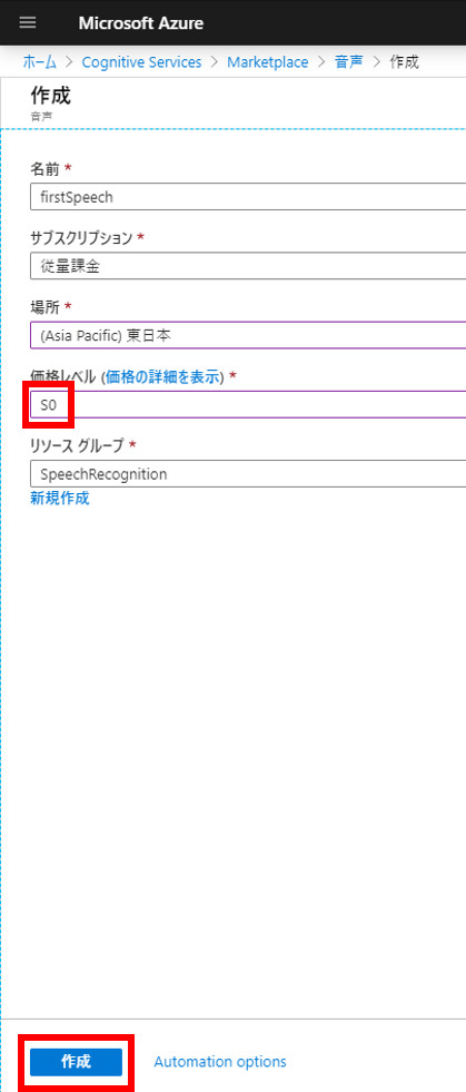 情報入力ページが表示される。名前は任意でよい。今回は「firstSpeech」にしてみた。場所は「東日本」。価格レベルは「SO」を選択する。今回利用するバッチ文字起こしはSOでないと利用できない。