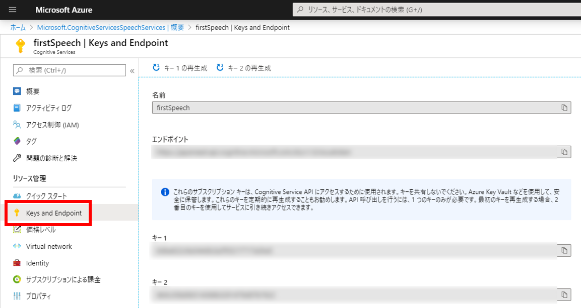 Cognitive Services画面の左メニューから「Keys and Endpoint」をクリックすると下図のようなページが表示されるので、サブスクリプションキーである「キー1」をメモしておく。 (このページはいつでも見にこれる。キー1とキー2はどちらでもよい)