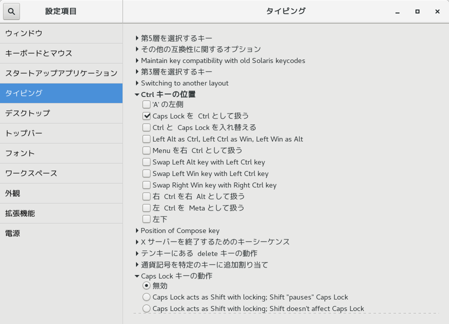 「Tweak Tool」>「タイピング」>「Ctrlキーの位置」>「Caps LockをCtrlとして扱う」をチェック