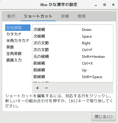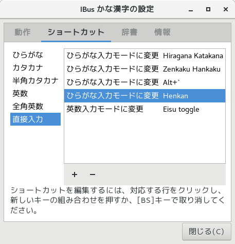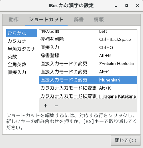 「ショートカット」>「ひらがな」>「元の候補」を変更 (直接入力モード変更に使いた無変換キーがここで使われているため別のキーを割り当てる)