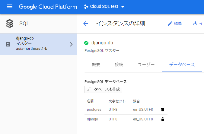「インスタンスの詳細」->「データベース」->「データベースを作成」でデータベースを新たに作成する。