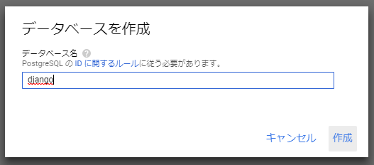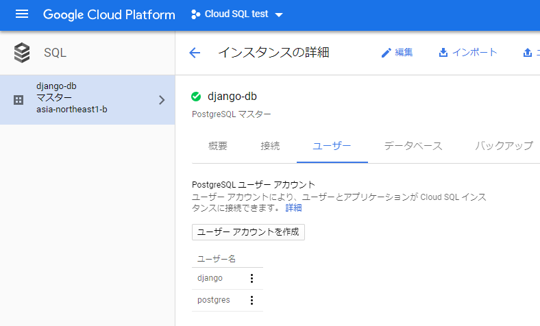 - SQLインスタンスのPostgreSQLユーザとデータベースを作成