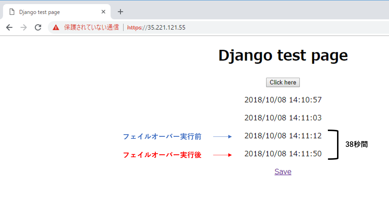 正確なDBサービス断時間ではないがアプリケーションからみた断時間は38秒間だった。