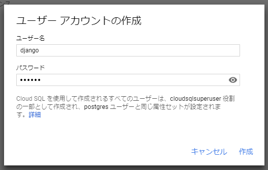 「インスタンスの詳細」->「ユーザ」->「ユーザアカウントを作成」でPostgreSQLユーザを新たに作成する。