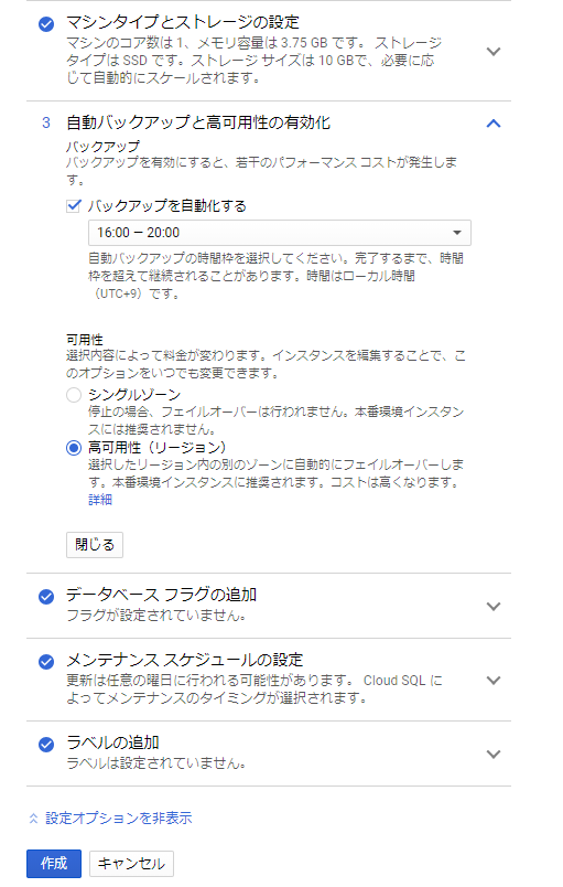 特筆する点は、1. 「接続の設定」で「プライベートIP」を追加、2. 「自動バックアップと高可用性の有効化」で「高可用性」をチェックすること。