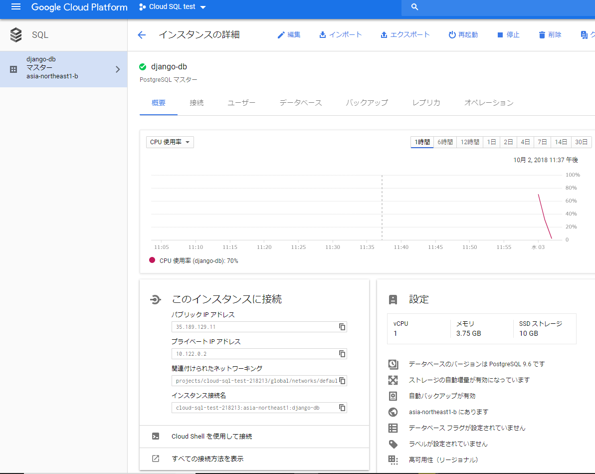 今回メインテーマのフェイルオーバー。 本来はメインのサーバ(マスター)が障害等でシャットダウンした際に発生するものだが、Cloud SQLには手動でフェイルオーバーする機能がついているので、今回はその機能を使ってサービス断時間を計ってみる。