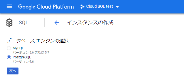 GCPのコンソールから「SQL」->「インスタンスを作成」でDBサーバのインスタンスを作成する。