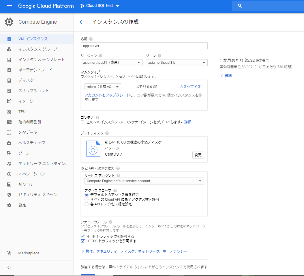 GCPのコンソールから「Compute Engine」->「VMインスタンス」->「VMインスタンスを作成」でインスタンスを作成する。