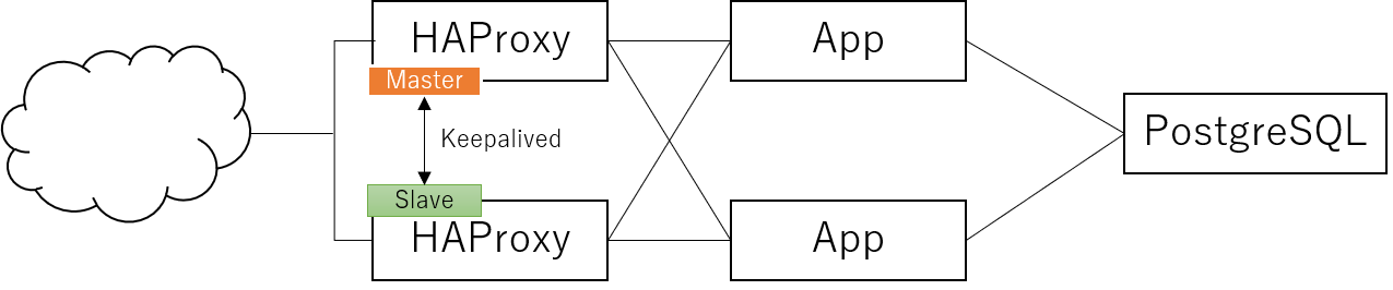 LBのバックにはアプリケーション本体を2台にデプロイするようにして、片方が落ちてもサービス継続できるようにした。(今時で言うとKubernetesやDocker Swarmなんだけど、運用容易性の観点から単純にアプリのプロセス立ち上げるだけで良いようにした)