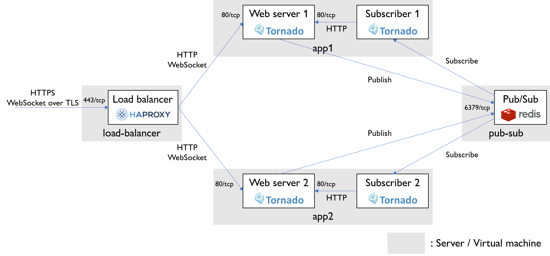 ロードバランサーにはHAProxyを利用する。特別な設定をしなくてもWebSocketのセッションを認識してルーティングしてくれるみたい。(ちゃんと設定しようとするとこちらの記事にあるようにタイムアウトを個別に設定する必要がありそう。本稿ではデフォルト設定) また、SSLオフロードによりロードバランサーへのアクセスにはHTTPS/WebSocket over TLSを使用し、後段のサーバとはHTTP/WebSocketで通信する。