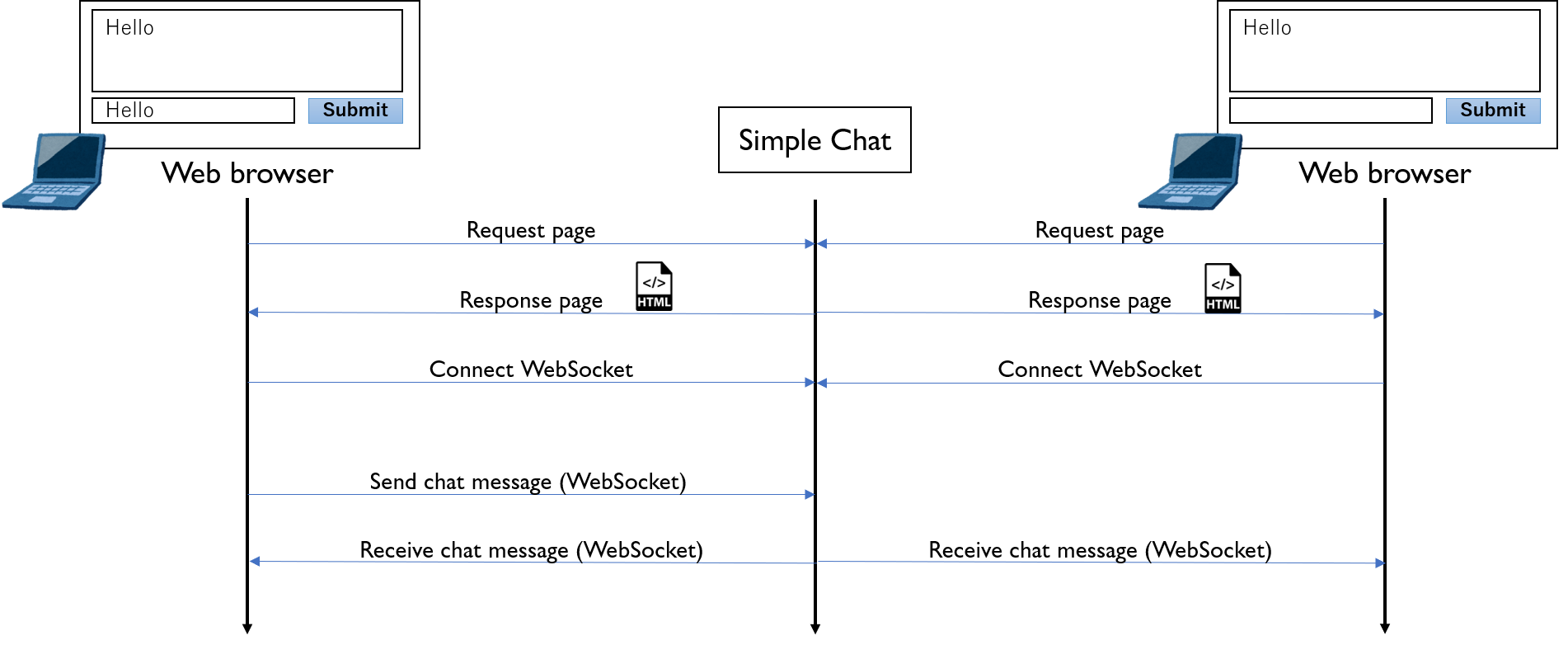- チャット入力欄に文章を入力し「Submit」ボタンを押すと、WebSocketを使ってアプリにメッセージを送信する。