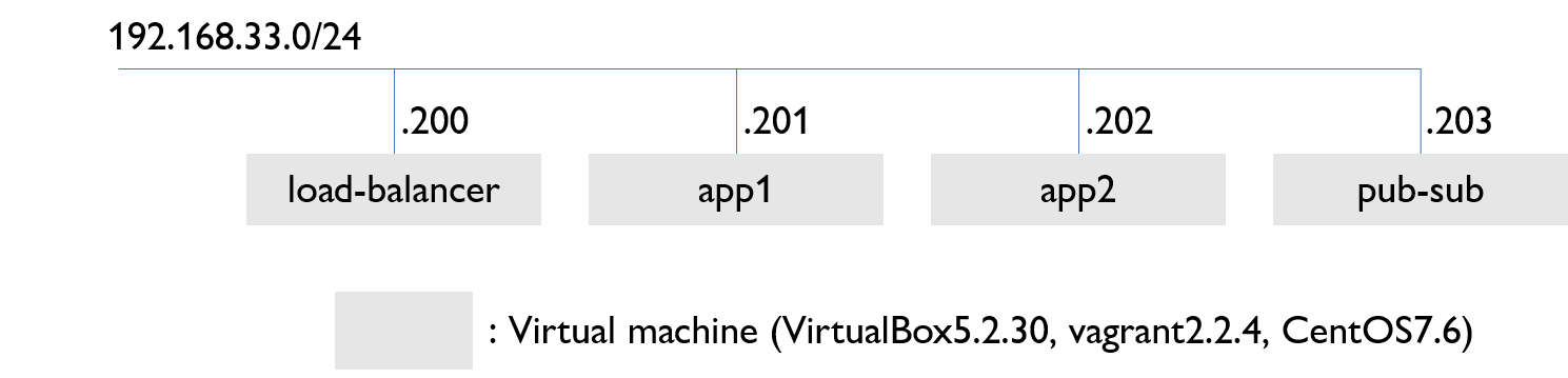 同一サブネットにロードバランサー、アプリケーションサーバ2台、Pub/Subサーバの合計4台のサーバを配置する。今回の検証ではサーバはVirtualBoxのVMを利用し、vagrantで管理している。ゲストOSはCentOS。