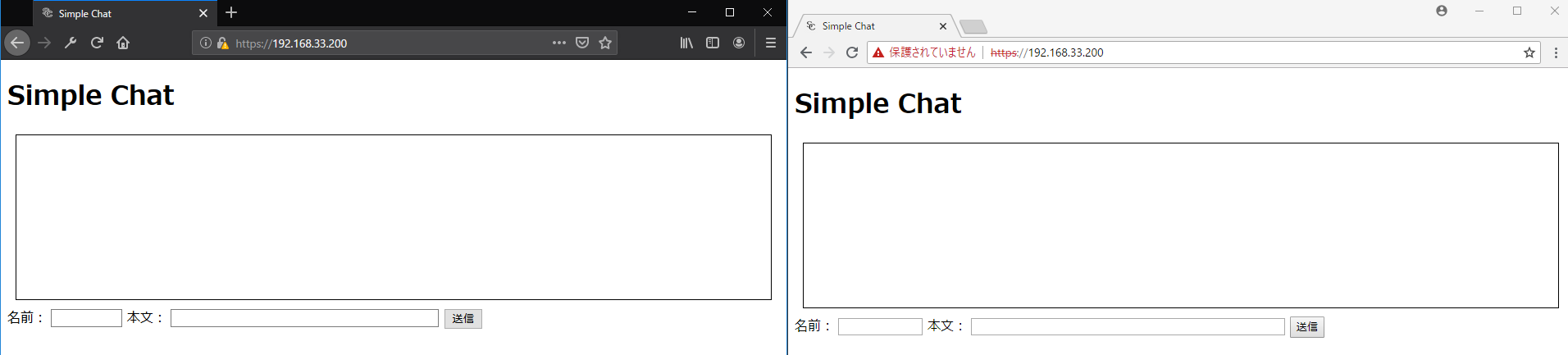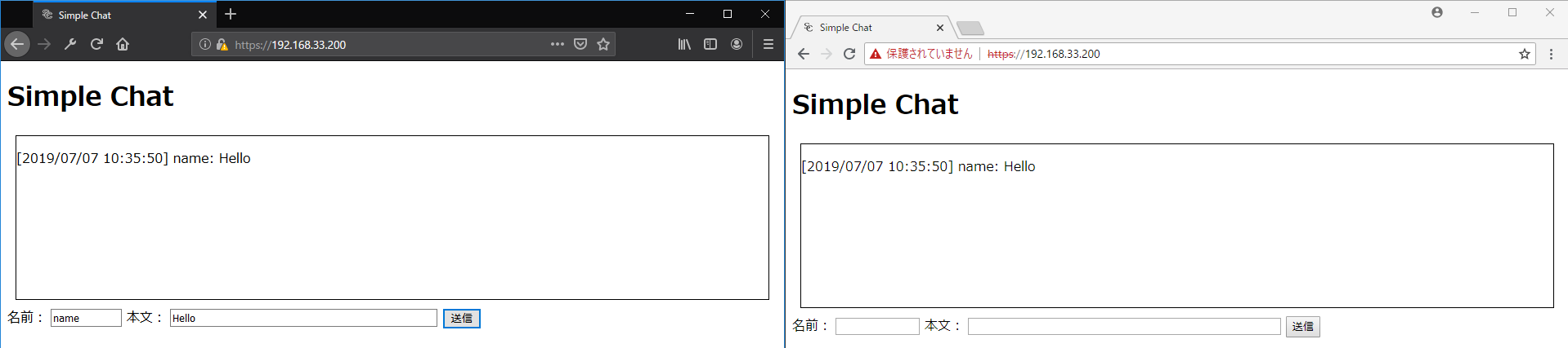 2つのブラウザでhttps://192.168.33.200にアクセスするとチャット画面が表示される。(192.168.33.200はロードバランサーのIPアドレス)