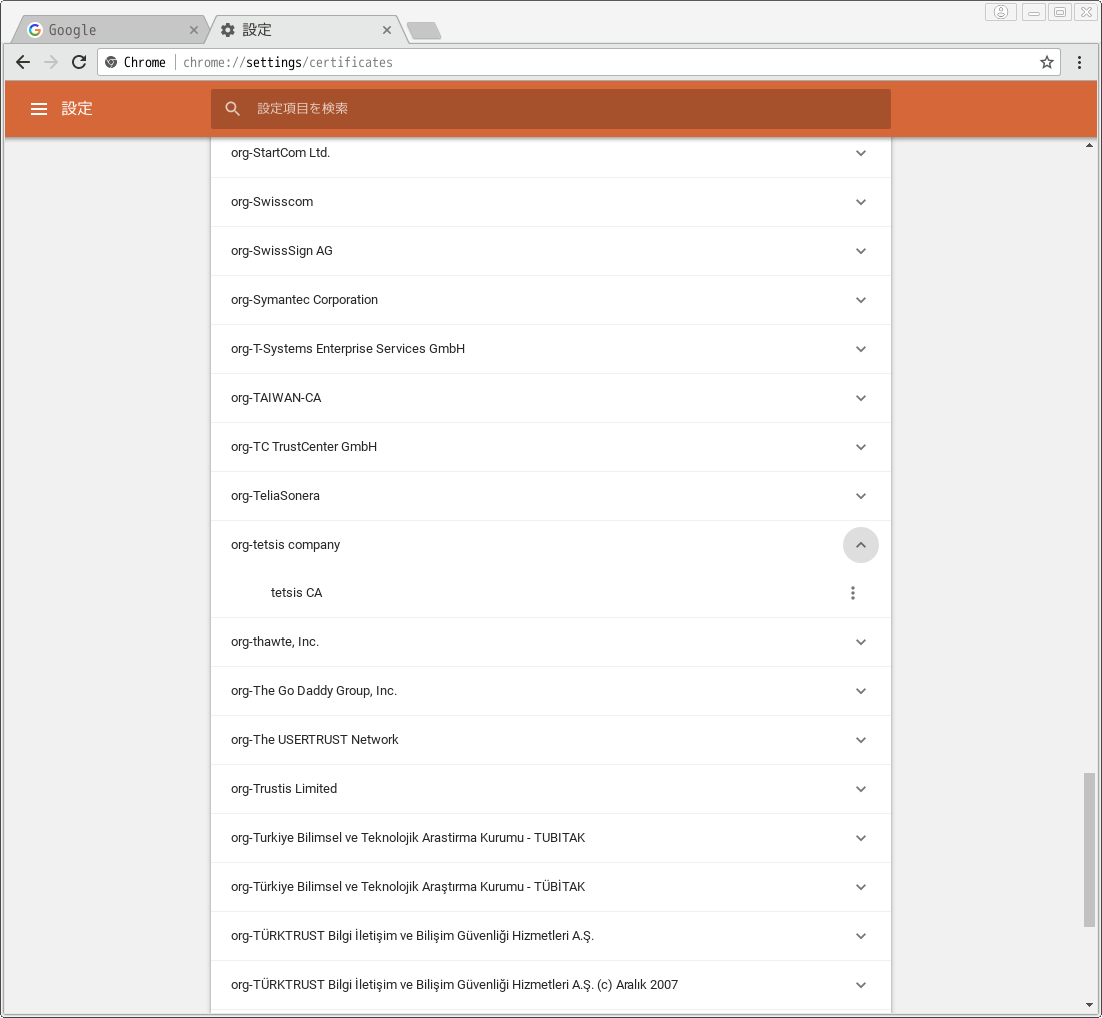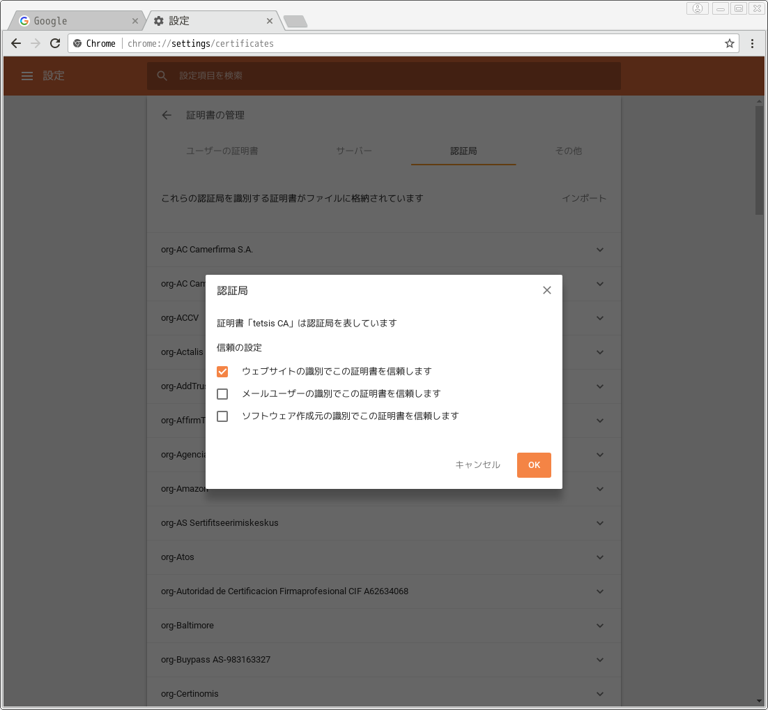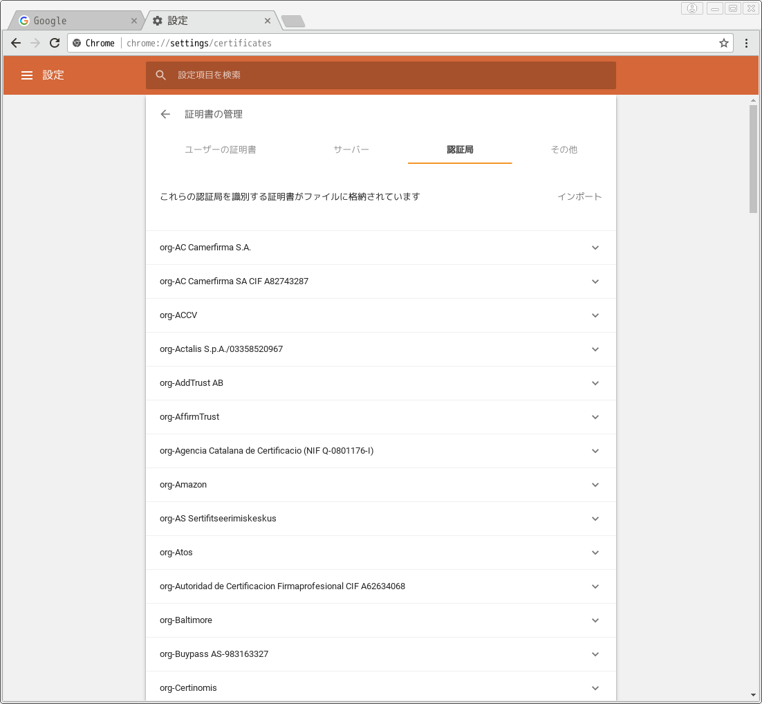 ブラウザにオレオレCA証明書(cacert.pem)を追加 (Google Chrome) Link to heading