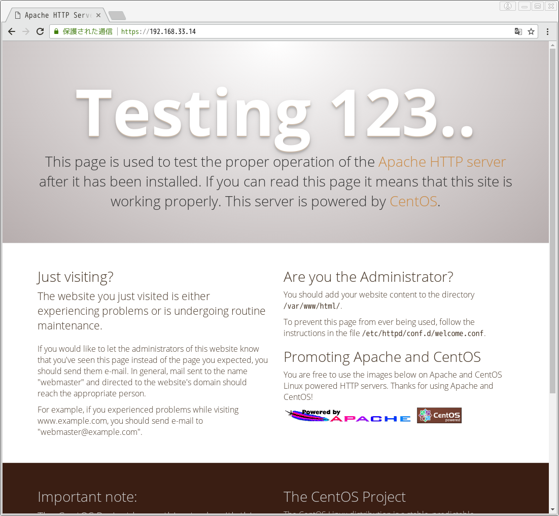 Chromeで「https://(IPアドレス(今回の例では192.168.33.14))」にアクセスするとそのままページが表示される。