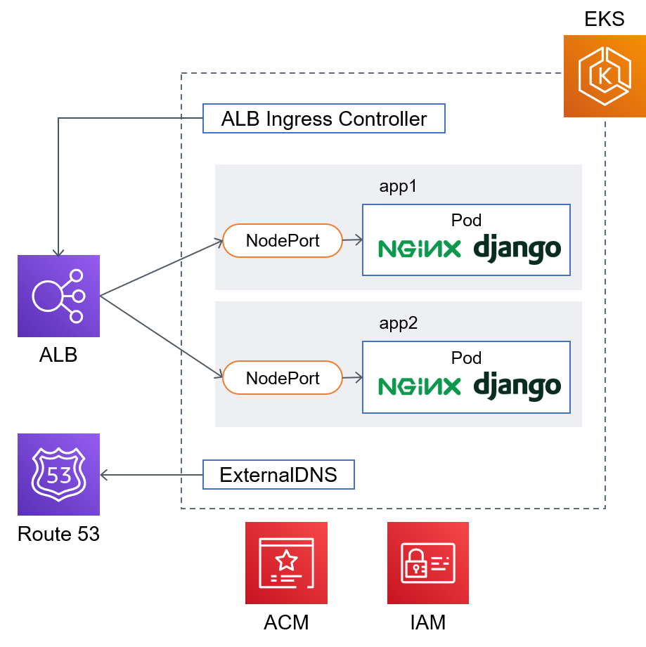 今回使うアプリケーションはDjangoとその前段にリバースプロキシとしてnginxを配置したシンプルなもの。EKSクラスタ内にはその他にALBにルール反映してくれるALB Inress ControllerとRoute 53にレコード反映してくれるExternalDNSのpodが起動している。SSL証明書発行にはACMを利用。