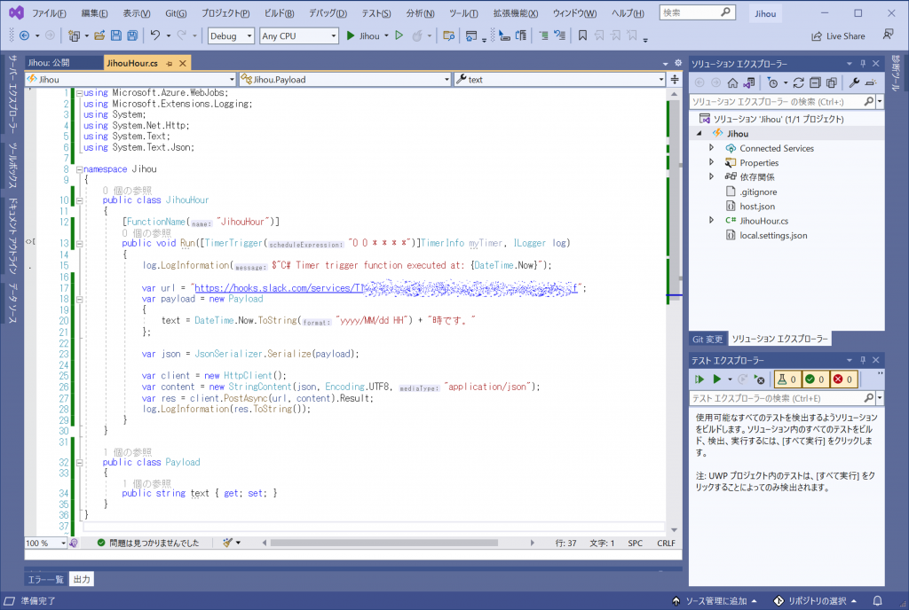 尚、その場で動作を確認したい場合はVisual Studioのデバッグ([F5]キー)機能が使えます。その際は実行間隔を短く設定すればすぐに動作を確認できます。例えば [TimerTrigger("0 */1 * * * *")] とすれば1分ごとに実行してくれます。