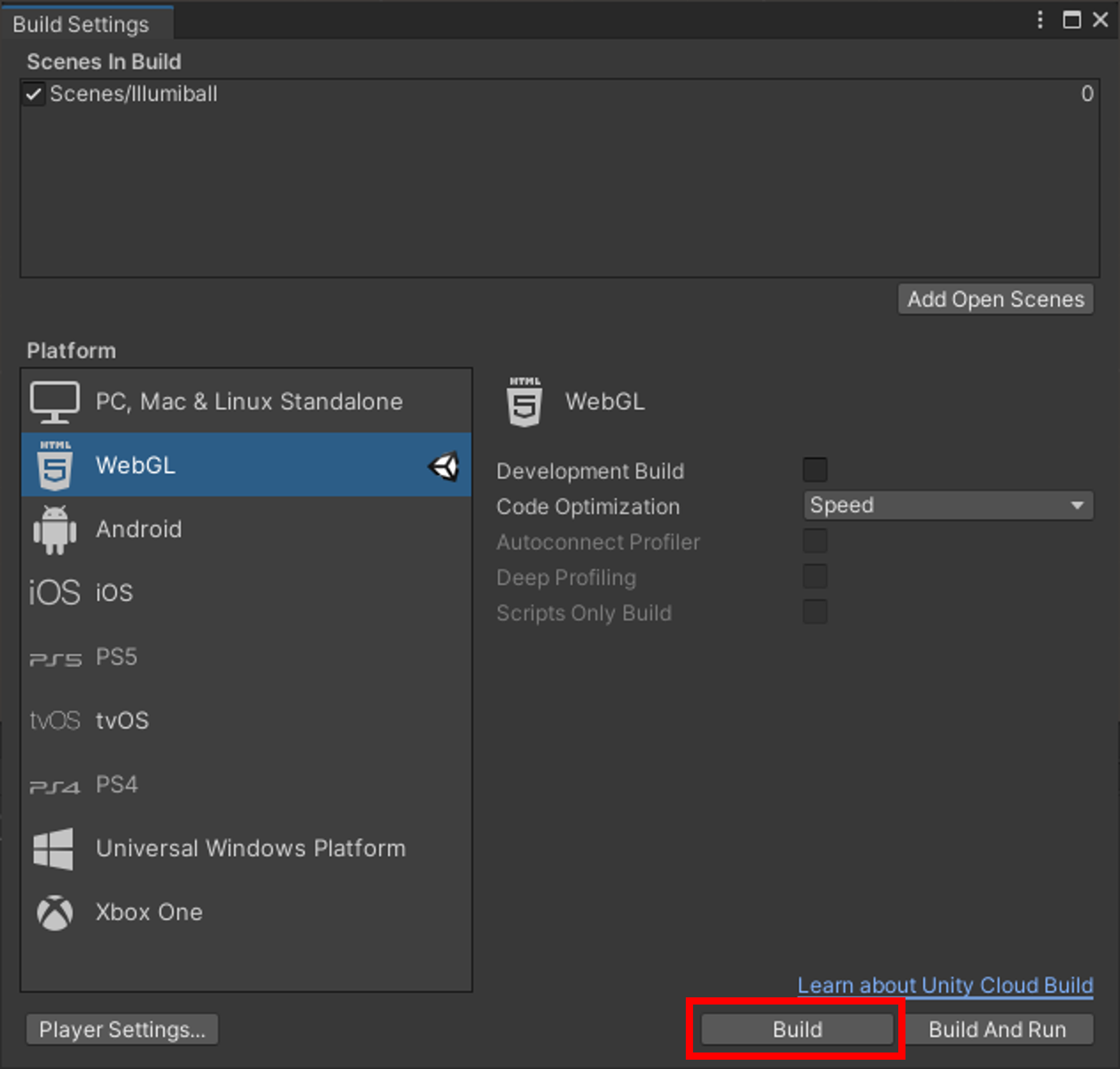 - [File] -> [Build Settings…] とクリックし、ビルド設定ダイアログを開く