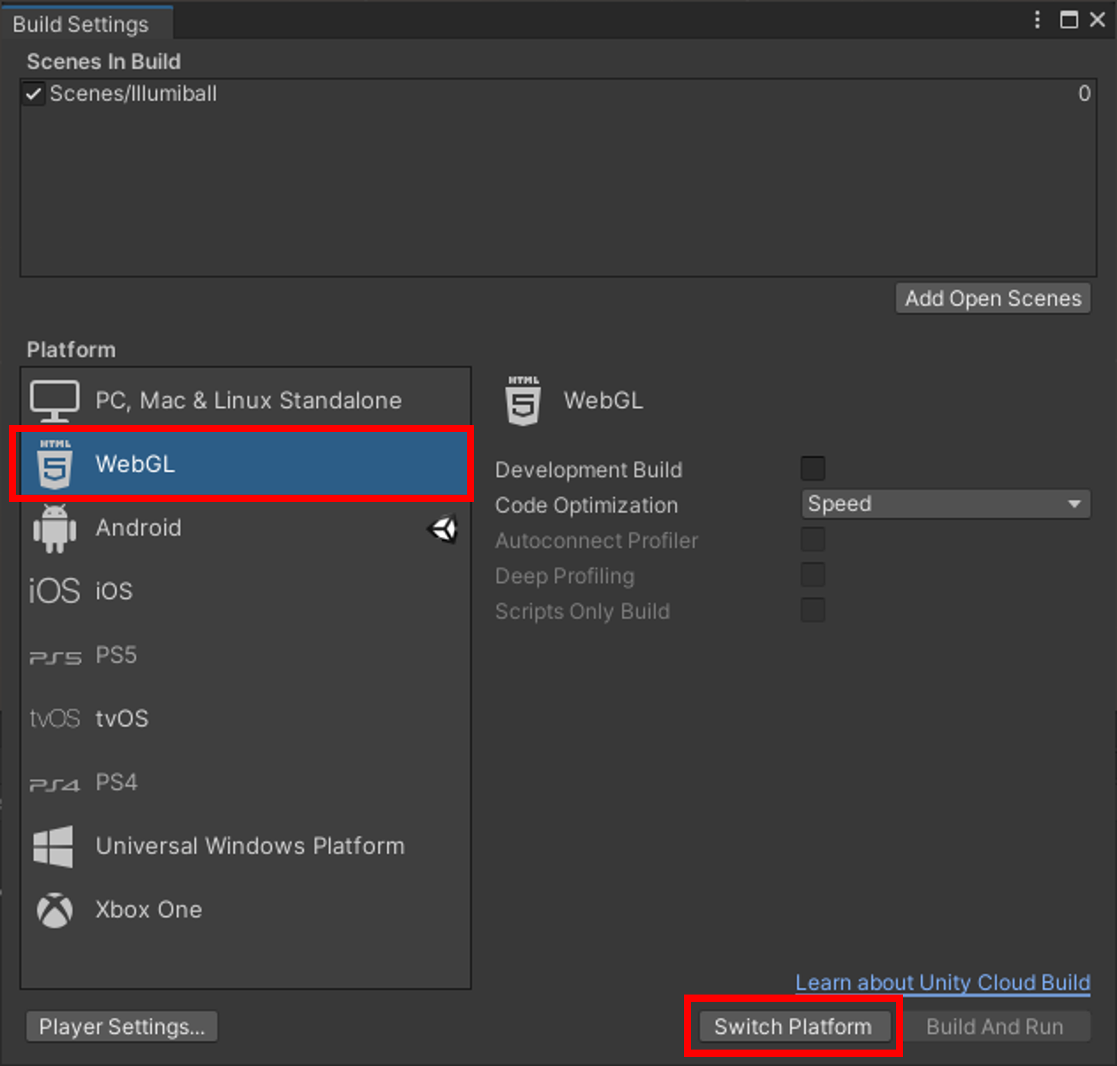 - [Platform] で [WebGL] を選択し、 [Switch Platform] をクリックする