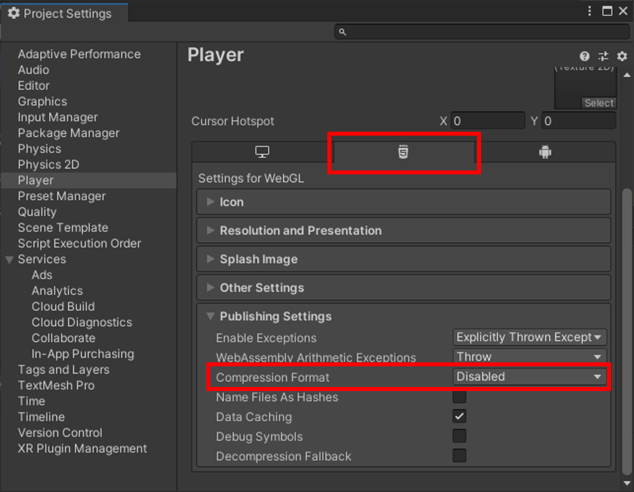 - [Publishing Settings] の [Compression Format] を [Disabled] にする